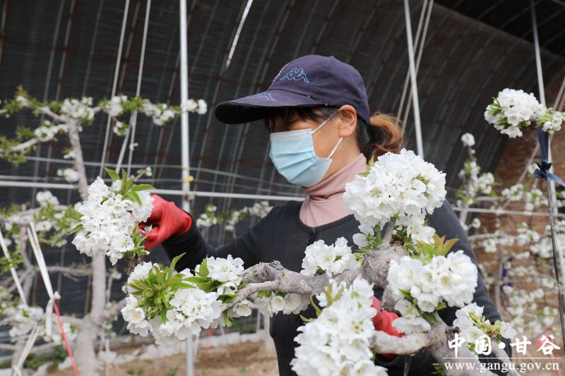 1月19日,虽然正值寒冬时节,而在安远镇巩川村设施樱桃示范园区大棚内,樱桃花竞相绽放,一簇簇洁白的花朵挂满枝头,果农正忙着给樱桃树疏花浇水,以保证果实生长发育正常,确保大棚樱桃丰产丰收,大棚里一派春意盎然的景象。
