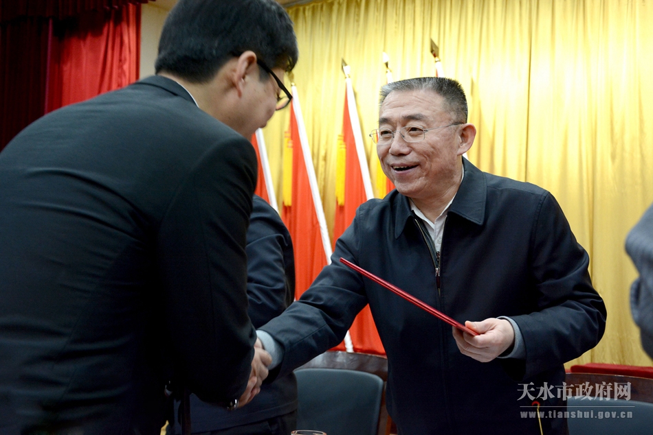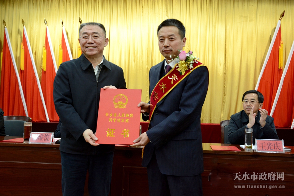 3月17日,天水市科技创新大会在市迎宾馆召开,会议表彰了2016年度天水市科技工作先进集体和先进个人。当主持人天水市委副书记、市长杨维俊宣布由天水市委书记王锐同志为“天水市科技功臣奖”获得者——天水市电气传动研究所有限公司董事长王有云颁发获奖证书时,坐在主席台上的王锐书记立即起身,快步从主席台后走到主席台前正中,面带微笑,伸出右手,迎上前去与上台领奖的王有云亲切握手,颁发证书后,还特意与王有云合影留念,引发现场热烈的掌声。