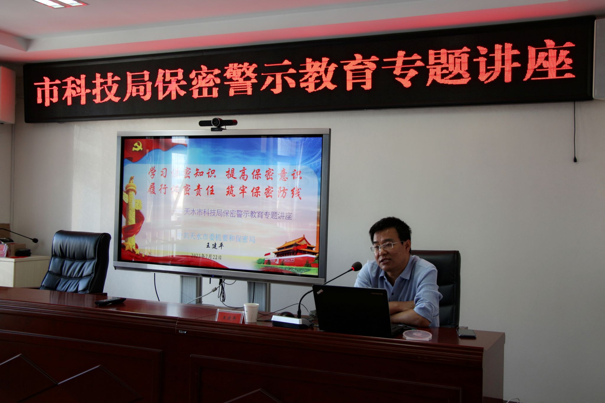 为进一步提高全体干部职工的保密意识,增强维护国家安全和保守国家秘密的责任感与使命感,7月21日,市科技局举办了保密警示教育专题讲座。邀请中共天水市委机要和保密局四级调研员、保密督查科科长王建平做了以《学习保密知识,提高保密意识,履行保密责任,筑牢保密防线》为题目的保密警示教育专题讲座。专题讲座通过以案说法、以案示警、以案促管展开了一堂内容丰富、逻辑严谨深刻的警示教育课,对推动市科技局做好机关保密工作有较强的针对性和指导性。