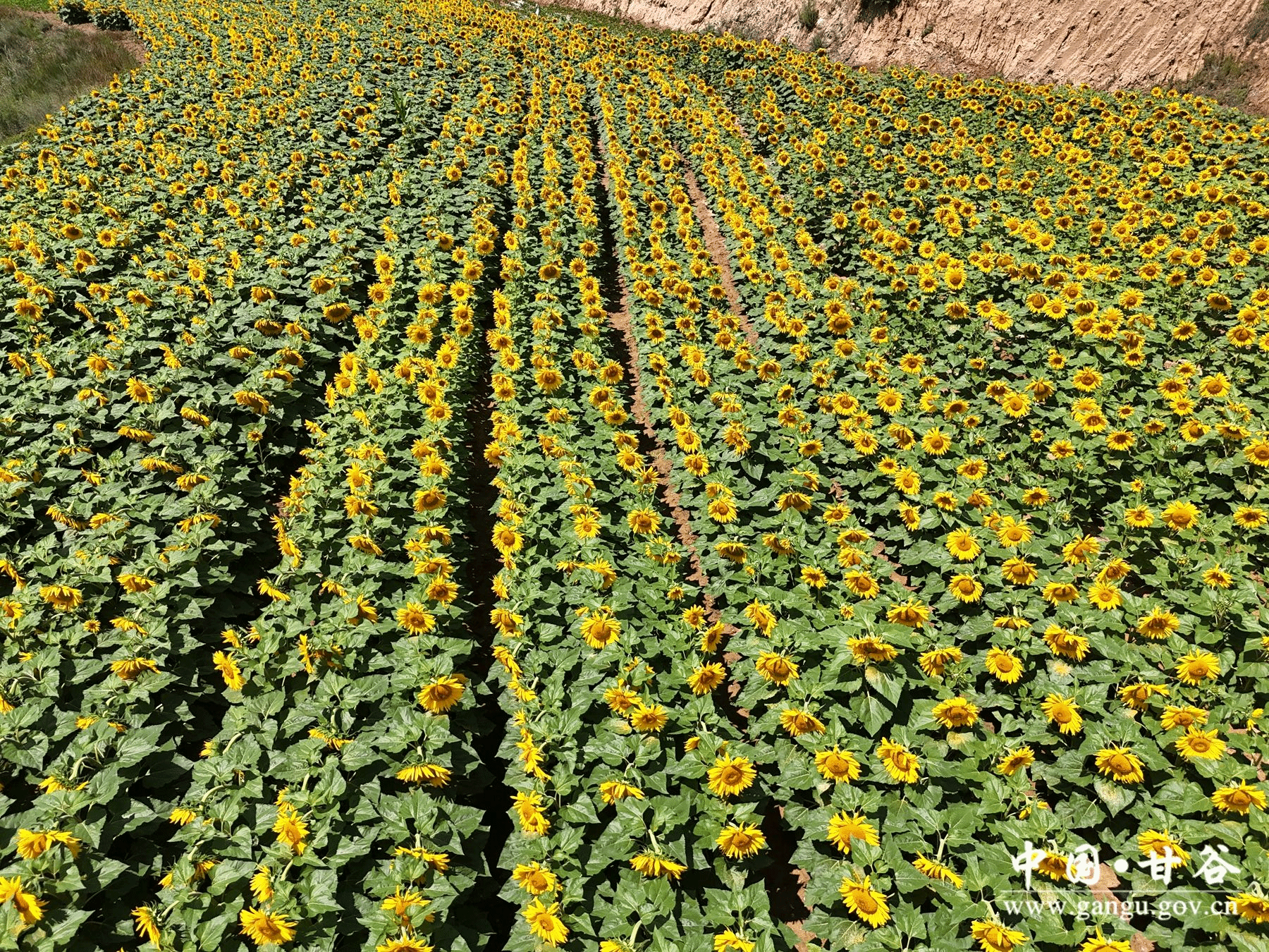 “此花莫遣俗人看,新染鹅黄色未乾”。近日,甘谷县武家河镇石庙咀村的400亩向日葵向阳而开,层层叠叠的梯田上,葵花绵延如带,在青山绿野间格外耀眼夺目。今年,石庙咀村积极引进油葵推广种植,这种葵花产籽高,是我国四大油料作物之一,其油又含有丰富的“亚油酸”,被誉为21世纪“健康营养油”。