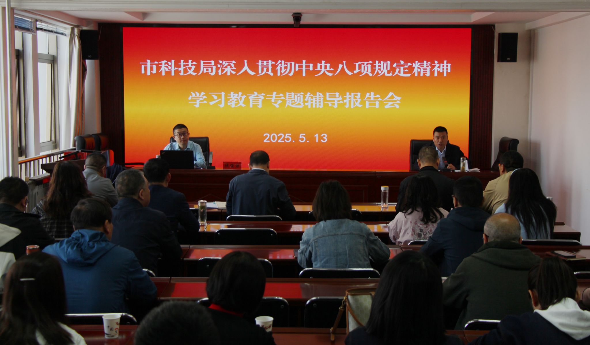 5月13日,市科技局举行深入贯彻中央八项规定精神学习教育专题辅导报告会,深入学习贯彻习近平总书记关于加强党的作风建设的重要论述和中央八项规定及其实施细则精神,邀请市委讲师团成员、市委党校副教授侯强强作专题辅导报告。局机关和局属各单位全体党员干部职工参加会议。