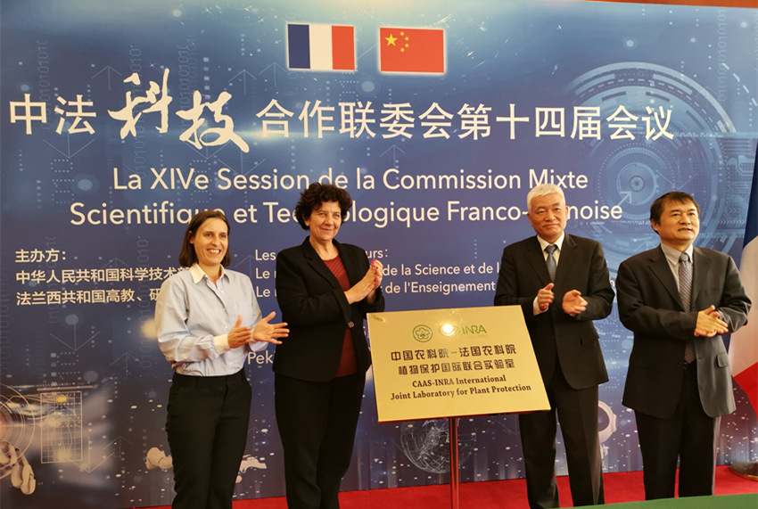 王志刚部长和维达尔部长共同为中国农科院-法国农科院植物保护国际联盟实验室成立揭牌(李宏策摄)