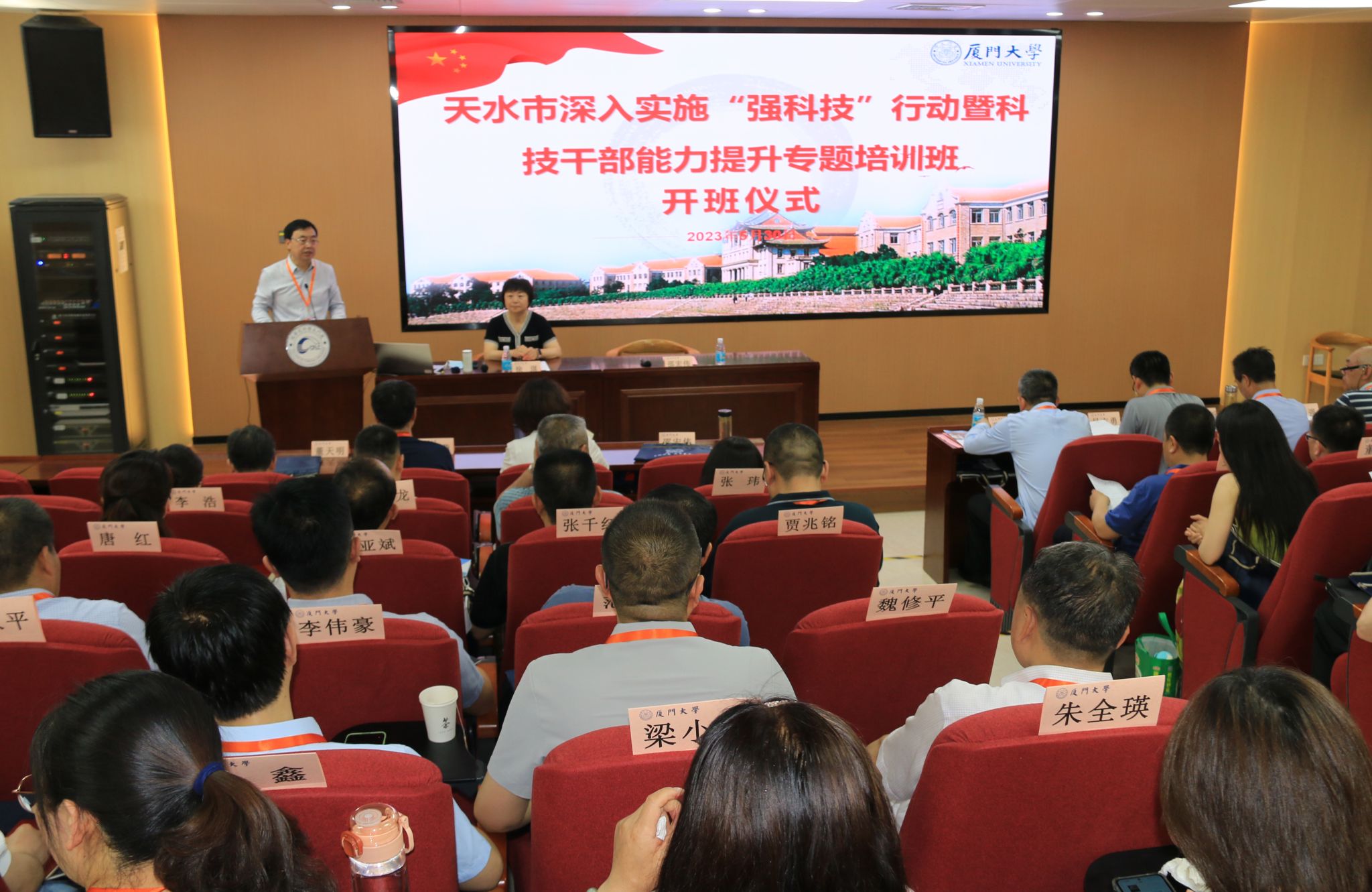 为深入学习贯彻党的二十大精神,落实省市“强科技”行动部署,切实加强科技干部政治能力和履职能力建设,进一步提升科技干部专业化素养,根据中共天水市委组织部下达的2023年度市一级党员干部教育培训项目计划,5月30日至6月3日,市委组织部和市科技局在厦门大学外文学院举办了全市深入实施“强科技”行动暨科技干部能力提升专题培训班。市直有关部门负责同志,市科技局相关科室、局属单位负责同志和业务骨干,各县区科技局负责同志,有关科技企业负责同志近50人参加了培训。市政府副秘书长邵宏伟作开班动员讲话。