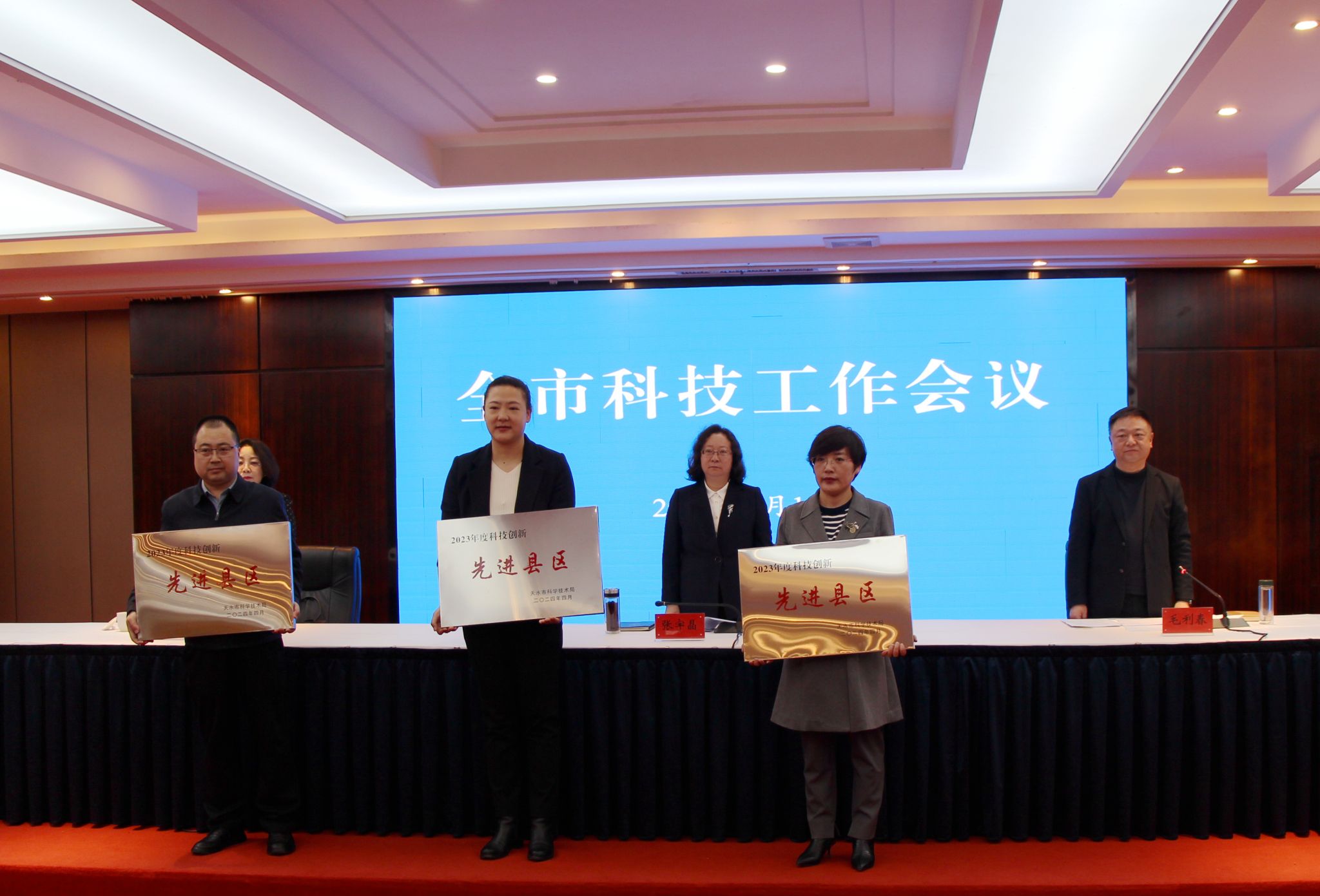 会议表彰了2023年度科技创新工作先进县区,为省级创新型县、省级技术创新中心、高新技术企业进行了授牌,麦积区政府、武山县政府、甘肃旭盛显示科技有限公司、甘肃睿阳科技有限公司作了交流发言。市科技局局长焦继军作了工作报告。