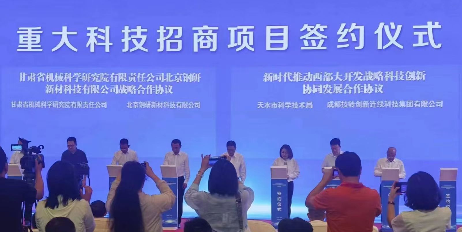 签约仪式上,市科技局党组成员、副局长董赟与成都技转创新连线集团有限公司副总经理吴镝签订了“新时代推动西部大开发战略科技创新协同发展”合作协议;甘肃陇鼎新材料有限公司董事长汪秀锋与天津美好科技有限公司副总经理魏鹏签订了“智能化装配式建筑生产基地”项目协议。