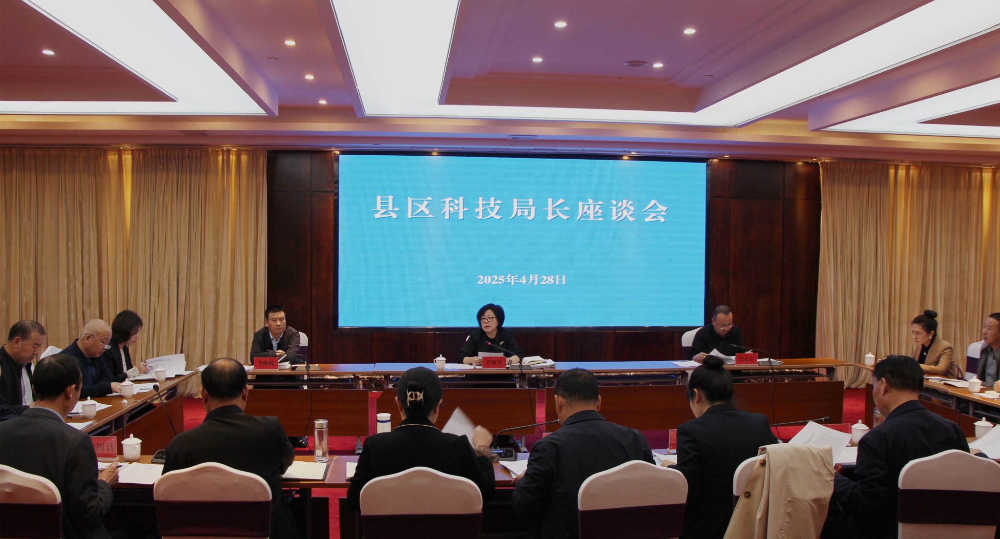 4月28日,市科技局召开县区科技局长座谈会,市科技局领导班子成员、各县区科技局、经开区经发局局长和局机关各科室、局属各单位负责人参加,市科技局局长焦继军主持并讲话。