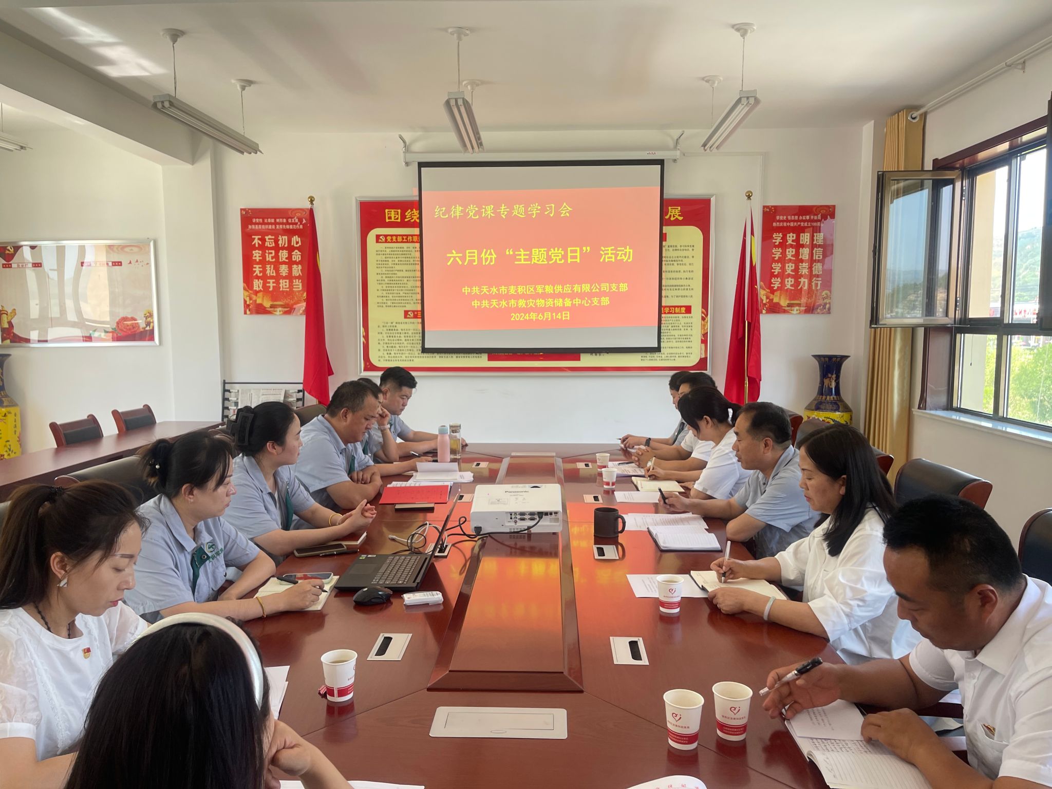 为深入学习贯彻习近平总书记关于党纪学习教育的重要讲话和重要指示精神,深入学习领会新修订的《中国共产党纪律处分条例》,推动党纪学习教育取得实实在在成效。6月14日,市救灾物资储备中心党支部、麦积区军粮供应有限公司党支部联合开展了“主题党日”活动。共计15名党员参加活动。