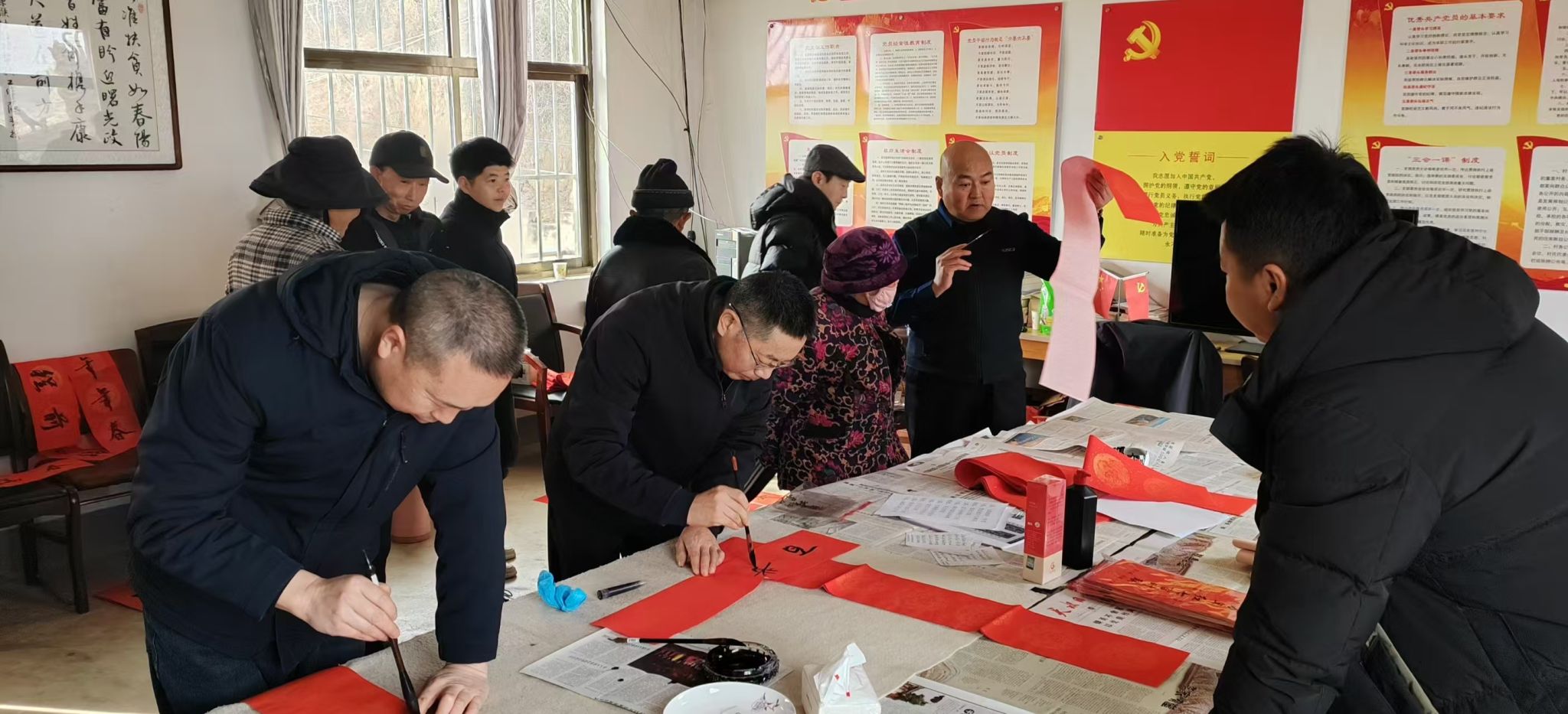 活动现场氛围热烈而温馨,书画爱好者们结合乡村生活、新春愿景与文明新风,精心创作兼具艺术性与实用性的春联与福字,既有“家和业兴添富贵,国泰民安享太平”的吉祥祈愿,也有“乡村振兴谱新篇,文明新风润心田”的时代赞歌,更有贴合农家生活、饱含乡土温情的通俗佳句,不仅能让村民们近距离领略中华传统书法艺术的独特韵味,还能让文化惠民的温暖直抵人心、浸润民心。