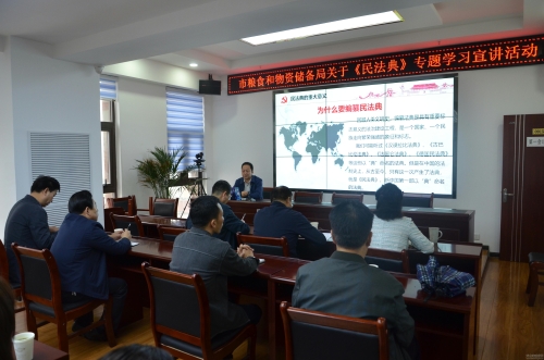 9月25日,市粮食和物资储备局组织开展了《民法典》专题学习宣讲活动,天水市《民法典》律师宣讲团成员、天秦律师事务所主任王朝晖受邀做专题辅导。市粮食和储备局党组成员、副局长令天成主持并讲话。局机关各科室及直属各企事业单位共30余人参加。