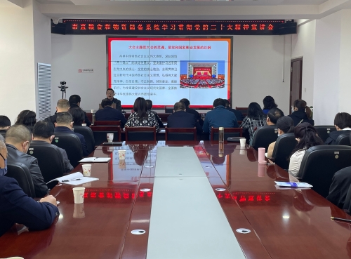李尚平强调,一要精心组织,迅速在全系统掀起学习宣传贯彻热潮。党员领导干部要带头学习,认真研读党的二十大报告和党章,原原本本学、逐字逐句悟,讲好专题党课、开展基层宣讲。全系统各级党组织要通过集中学习会、交流研讨会、“三会一课”“主题党日”、理论宣讲、理论测试和个人自学等多种方式,覆盖全体党员开展多层次、多形式的学习培训。要深入局直企事业单位、帮扶联系村、基层粮库等开展党的二十大精神宣讲活动,以实际行动带动干部群众的学习,做到真学真懂真信真用。二要深刻领会,确保党的二十大精神入脑入心见行见效。全体党员干部要深刻认识党的二十大的重大政治意义,深刻领会把握党的二十大的丰富内涵和精神实质,切实把思想和行动统一到党的二十大精神上来,更加深刻领会“两个确立”的决定性意义,更加坚定自觉增强“四个意识”、坚定“四个自信”、做到“两个维护”。要把深入学习贯彻党的二十大精神和学习贯彻落实习近平总书记关于粮食和物资储备工作系列重要指示批示结合起来,围绕省第十四次党代会和市第八次党代会部署要求,完善发展思路,锚定重点任务,细化工作措施,把党的创新理论不断转化为推动粮食和物资储备改革发展的强大动力。三要学以致用,高质高效完成全年粮食和物资储备各项工作。要把党的二十大各项决策部署和省市工作要求转化为粮食和物资储备各项工作要点。要认真开展全年重点工作任务“回头看”,对重点工作任务完成情况进行全面梳理,查漏补缺,精准施策,加快推进,确保各项重点工作任务高质量全面完成。要加强监督检查,对党建、党风廉政建设、意识形态、精神文明建设等工作,按季度进行督导,整改落实存在的问题,不断提高党建工作质量。要完善制度机制,进一步巩固专项巡视巡察、专项审计和督查检查发现问题整改成果,持续深化作风建设,切实提升治理效能。要以学习贯彻党的二十大精神为契机和动力,扎实做好粮食安全责任制落实、应急物资储备管理改革、“十四五”项目实施、常态化疫情防控和明年特别是一季度工作谋划等重点任务,坚决扛稳保障区域粮食和物资储备安全重任,为奋力谱写中国式现代化建设天水新篇章贡献粮储智慧和力量。