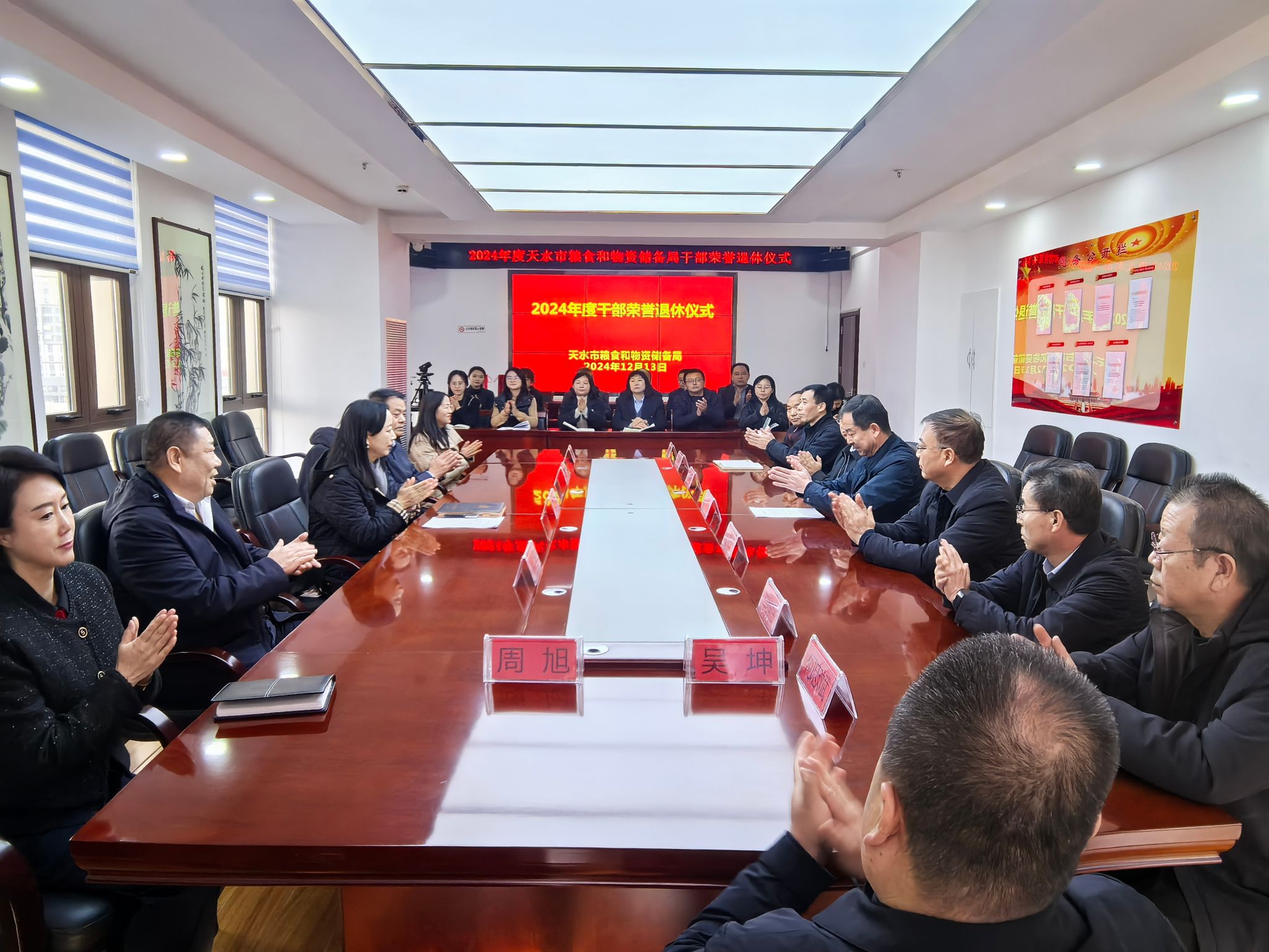 浓情惜别忆芳华,初心永驻续荣光。为进一步深入贯彻落实习近平总书记关于老干部工作的重要论述,增强退休干部的荣誉感、归属感和幸福感,激励广大干部传承优良作风,12月13日,天水市粮食和物资储备局隆重举行了2024年度干部荣誉退休仪式。局领导班子成员、机关全体干部职工及直属各单位负责人与退休干部们齐聚一堂,共同见证这一难忘时刻。