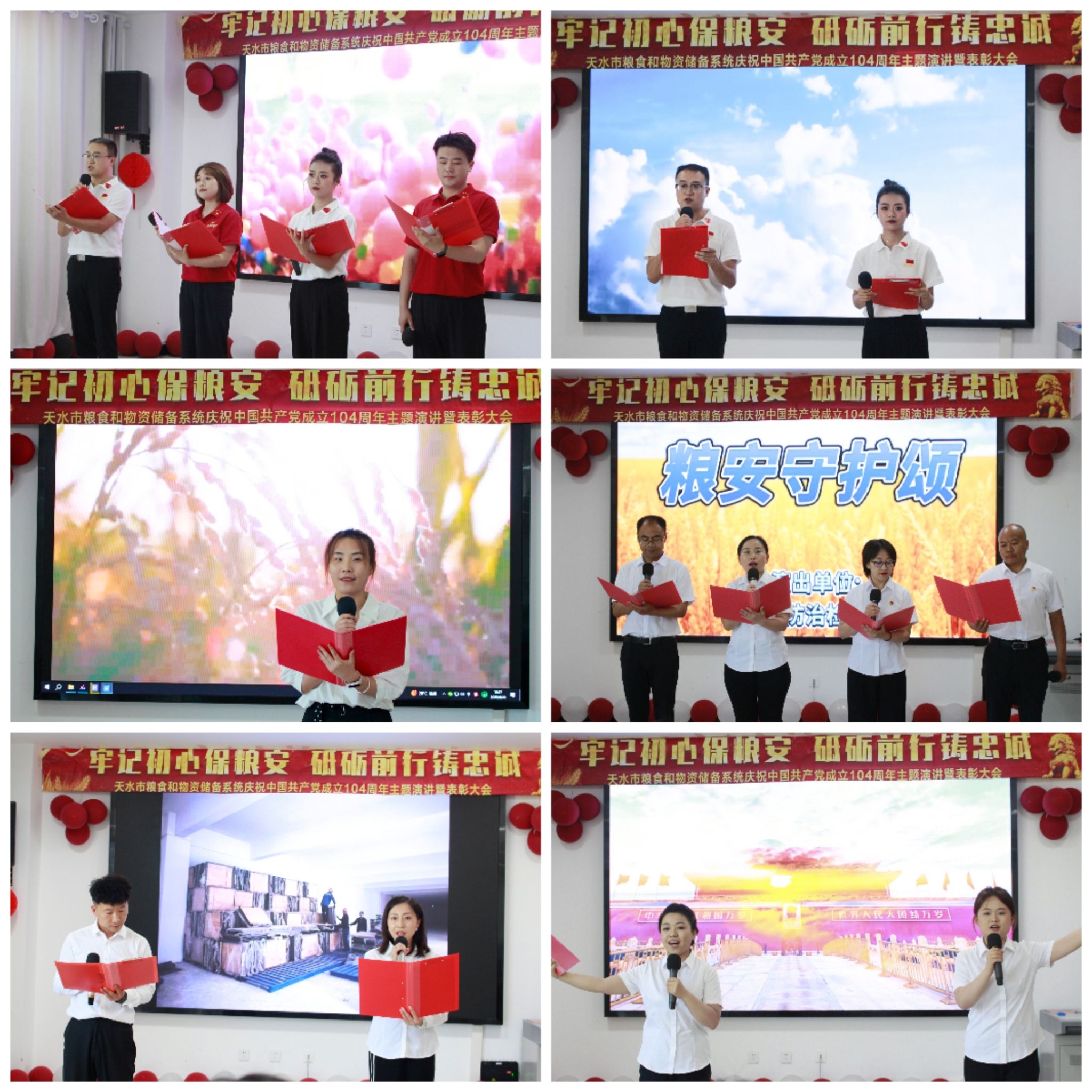 6月30日,天水市粮食和储备局举办“牢记初心保粮安,砥砺前行铸忠诚”庆祝中国共产党成立104周年主题演讲暨表彰大会,讴歌党的丰功伟绩和光辉历程,表彰市直粮储系统先进党支部、优秀共产党员和优秀党务工作者,市粮食和物资储备局领导班子成员及全体党员干部,市粮食和物资保障中心、市粮油防治检验中心、市救灾物资储备中心和市第一粮库有限公司、市军粮供应有限公司干部职工共计100余人参加。
