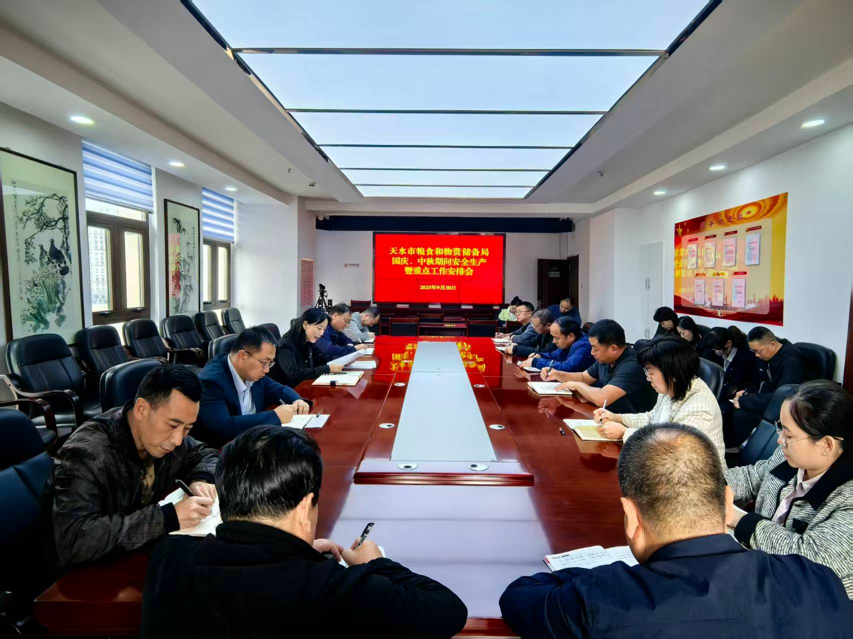 9月30日,天水市粮食和物资储备局召开国庆、中秋期间安全生产暨重点工作安排会,会议传达学习市委、市政府关于2025年国庆、中秋期间有关工作的安排,部署节日期间安全生产及重点任务推进工作。局领导班子成员、机关全体干部职工及直属单位负责人参加会议。