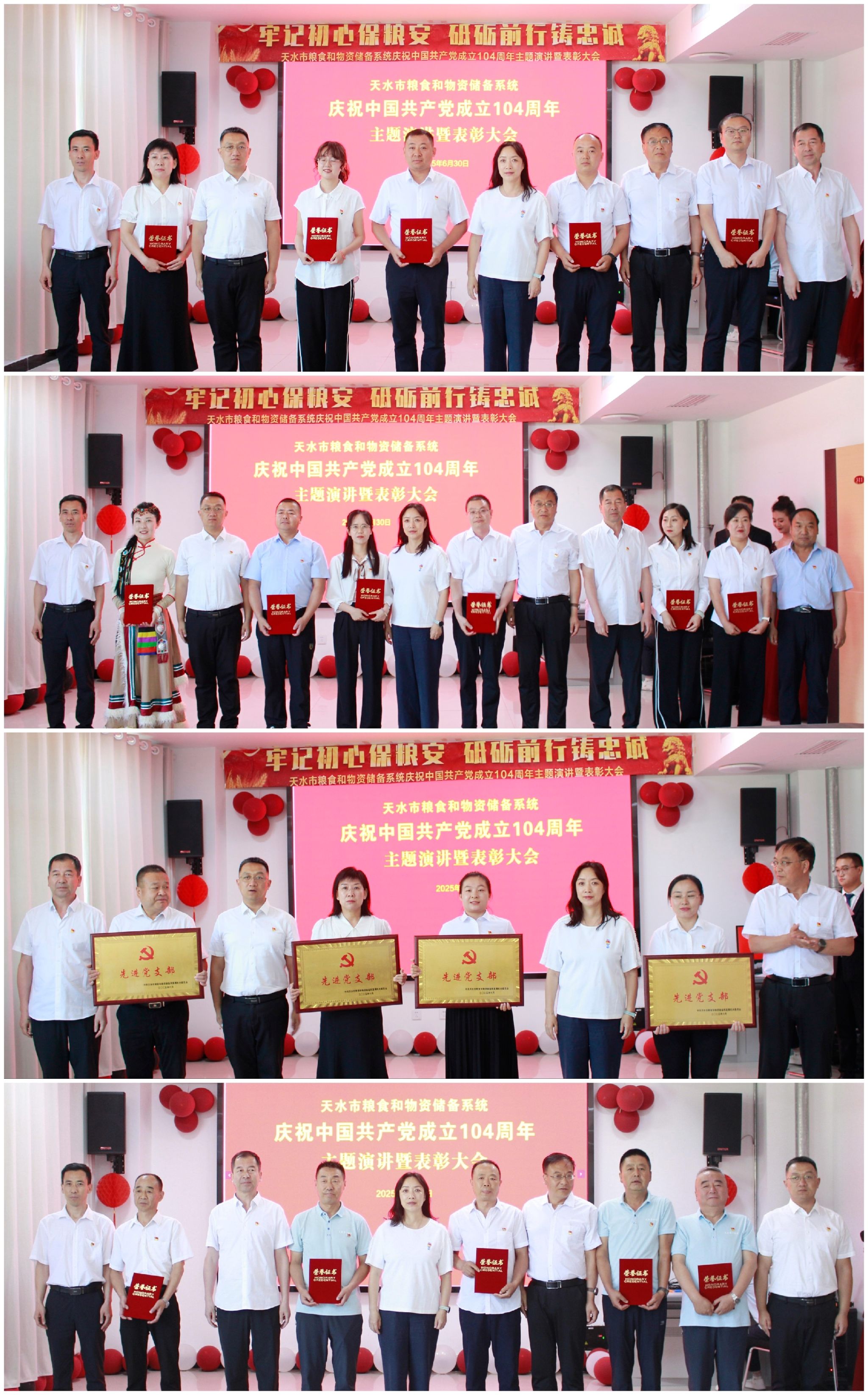 6月30日,天水市粮食和储备局举办“牢记初心保粮安,砥砺前行铸忠诚”庆祝中国共产党成立104周年主题演讲暨表彰大会,讴歌党的丰功伟绩和光辉历程,表彰市直粮储系统先进党支部、优秀共产党员和优秀党务工作者,市粮食和物资储备局领导班子成员及全体党员干部,市粮食和物资保障中心、市粮油防治检验中心、市救灾物资储备中心和市第一粮库有限公司、市军粮供应有限公司干部职工共计100余人参加。