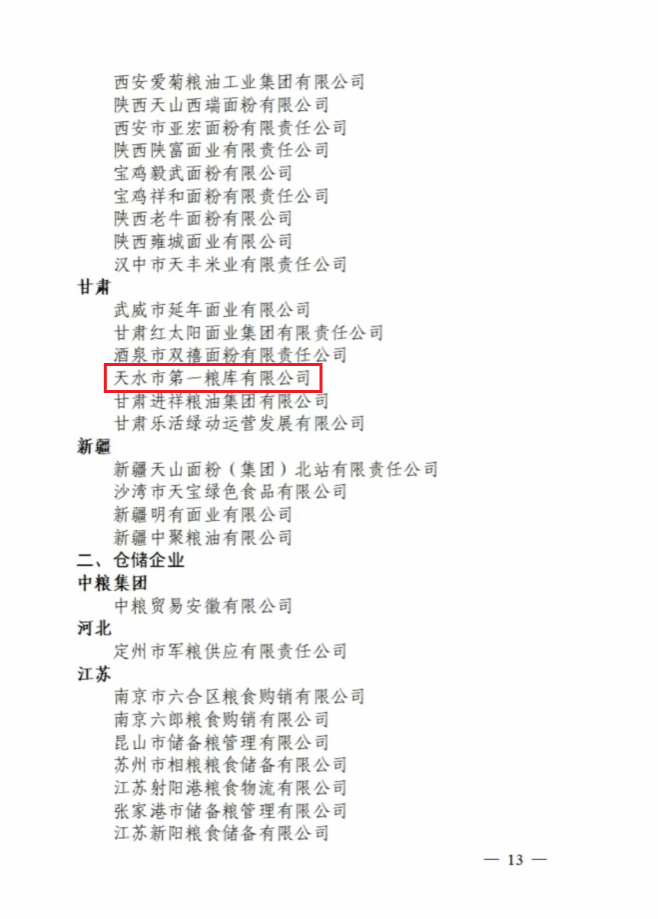 近日,中国粮食行业协会公布第十四批“全国放心粮油企业”名单,天水市粮食和物资储备局直属企业天水市第一粮库有限公司成功入选。这份国家级荣誉,是对企业坚守品质初心、严把粮油安全关的权威肯定,也标志着天水市粮油安全保障能力与品牌公信力再上新台阶。