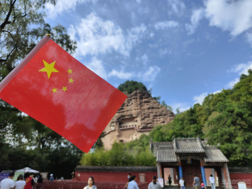 “金秋送爽山河美,红旗飘扬庆辉煌”,在庆祝中华人民共和国成立72周年之际,麦积山大景区再次飘扬起鲜艳的“中国红”,一面面国旗映衬着人们心中对美好生活的向往,诠释着内心对祖国最热烈的祝福。