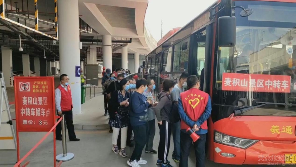 (麦积山景区中转车,游客排队上车)