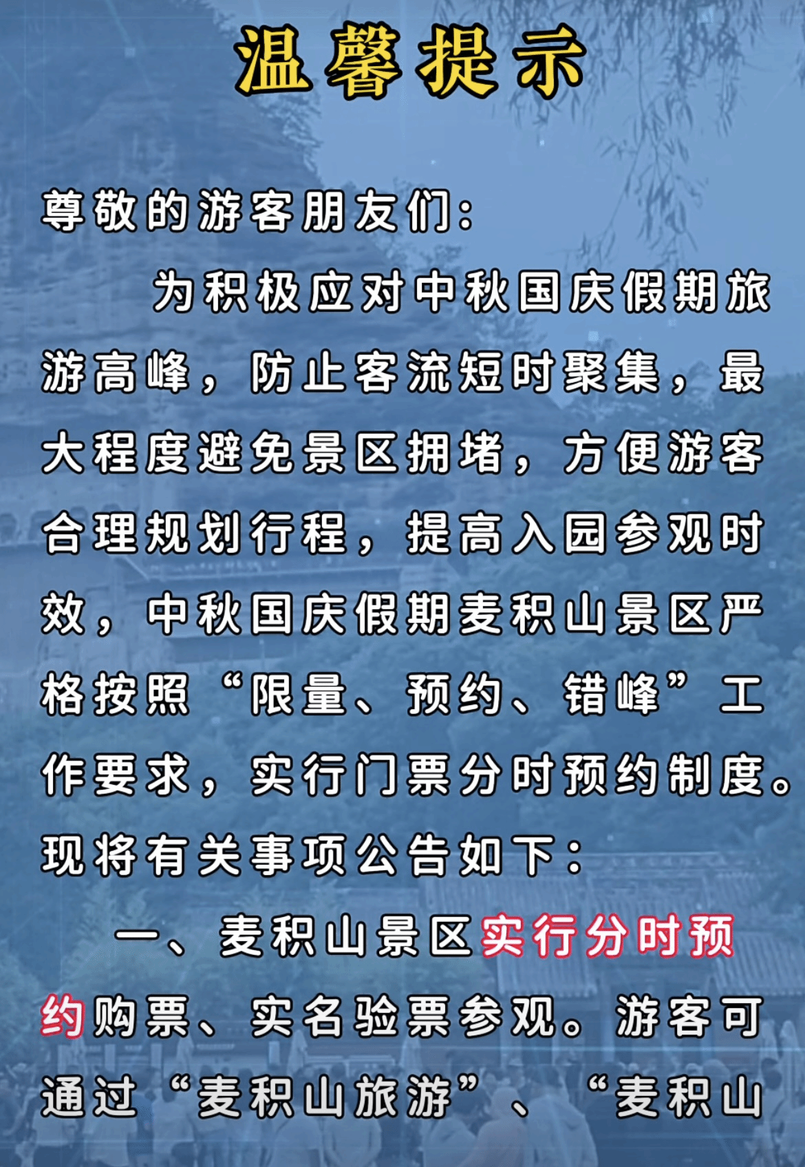 为了有效提升景区内节日宣传氛围,重点做好景区前端的宣传工作。节前,管委会联合携程旅游集团,组织西北三省旅游门店、旅行社举办了麦积山大景区旅游营销会,为国庆假日旅游提前预热。假日期间景区全面实行网络门票分时预约制,通过官方微信、网站、手机短信、新闻媒体发布景区游客容量和票务预警信息,引导广大游客安全、合理、错峰出行。针对中秋国庆假日特点,结合中秋传统文化教育、爱国主义教育主题,充分利用管委会官网、抖音直播、微信公众号和 LDE 大屏等充分利用景区入口、售检票等窗口电子屏,景区室外自助终端、LED大屏等设备,以及新媒体平台,为游客宣传中国传统文化知识和国防教育知识。吸引了游客对节日的强烈关注,全面提高麦积山大景区的知名度和影响力。