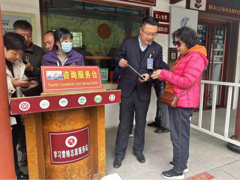为保证中秋国庆假期期间,游客体验更优质的服务,景区管委会以创建全国文明城市为主题,开展了旅游服务质量提升行动,将常态化服务管理各项要求落实落细。强化节日期间应急值班值守工作部署,提早运营、延时服务,在景区游客中心、停车场、石窟广场、观光车站、仙人湖码头等游客集中区域,设置党员示范岗、咨询服务台和志愿者服务岗,做好景区客流量监测预警、信息沟通和出行提示,完善游客投诉处理机制。紧盯游客诉求,以“用心服务好每一位游客”为服务理念,为游客提供交通引导、旅游咨询、茶水供应、行李寄存、景区旅游咨询投诉等服务,做到让每一位宾客都乘兴而来,兴尽而返。