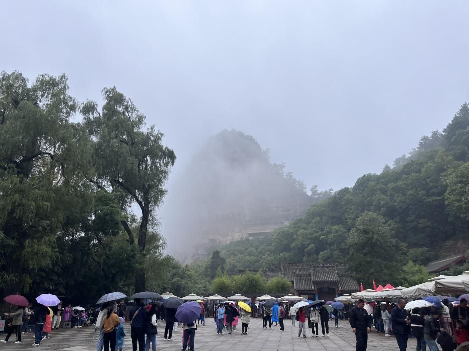 绵柔的秋雨给麦积山披上了浪漫的面纱,更是增添了几分神秘色彩,游客的热情持续高涨。国庆假期过半,麦积山大景区客流量稳步攀升,彰显出中华文化复兴的大潮,人民群众精神文化需求的日益高涨。