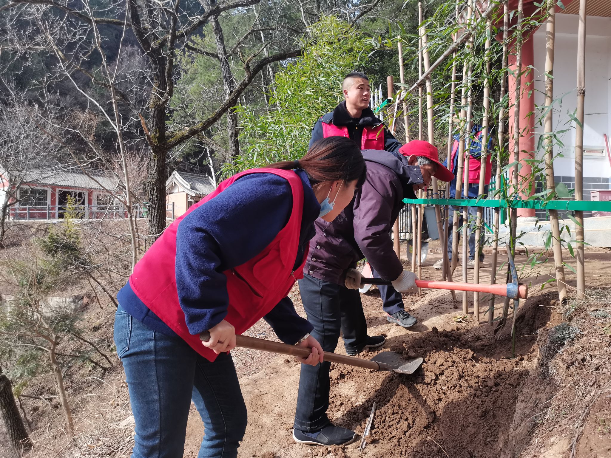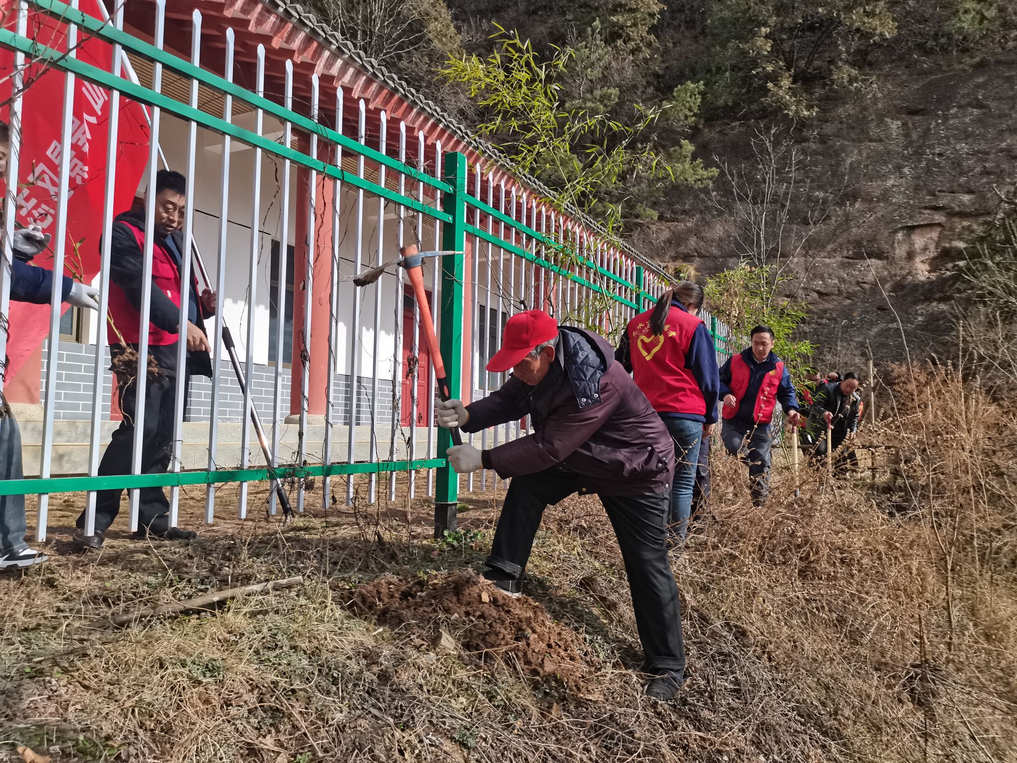 在活动现场,志愿者们热情高涨,听从统一指挥,认真栽种每一棵树苗。过程中,大家还相互交流环保知识和植树技巧,充分展现了团队合作精神。经过共同努力,自磨针殿广场至东崖有近百平米空白区域成功栽种树苗,为大地增添了生机与活力。