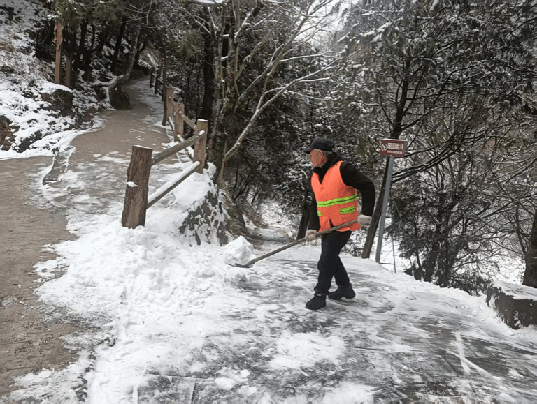 针对冬季气候特点,景区重点加强了安全巡查与应急保障。节前及假日期间,组织人员对主要游览步道、观景平台、停车场等区域进行了全面的安全隐患排查。面对近期的雨雪天气,景区及时开展清雪除冰作业,在陡峭、湿滑路段铺设防滑垫、设置醒目安全提示,并增派工作人员加强引导与提示,全力保障游客通行安全。