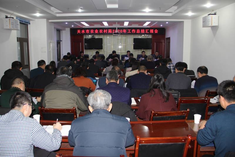 1月4日,天水市农业农村局召开2020年工作总结汇报会,全面总结全局2020年工作情况,谋划安排2021年工作。局领导班子成员、各级调研员,局机关副科级以上干部,局属单位班子成员共60余人参加会议。