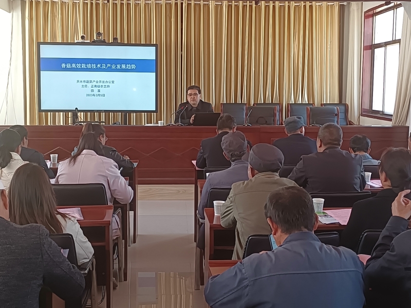 3月5日,专家组一行在武山县龙台镇政府举办了羊肚菌和香菇栽培技术培训会,秦州区高新技术服务中心正高级工程师王俊羿围绕羊肚菌的菌种选择、土壤处理、栽培管理、环境调控、病虫害防控等方面,市蔬菜办正高级农艺师田溪分别围绕香菇的菌种制备、栽培料配制、灭菌接种、保湿膜袋应用、养菌转色、催蕾育菇等方面,为龙台镇50多名镇村干部和食用菌种植户农户进行深入浅出的讲解和交流,并发放《香菇栽培技术》《黑木耳栽培技术》《食用菌高效栽培技术100问》等培训教材100本、明白纸200余份。