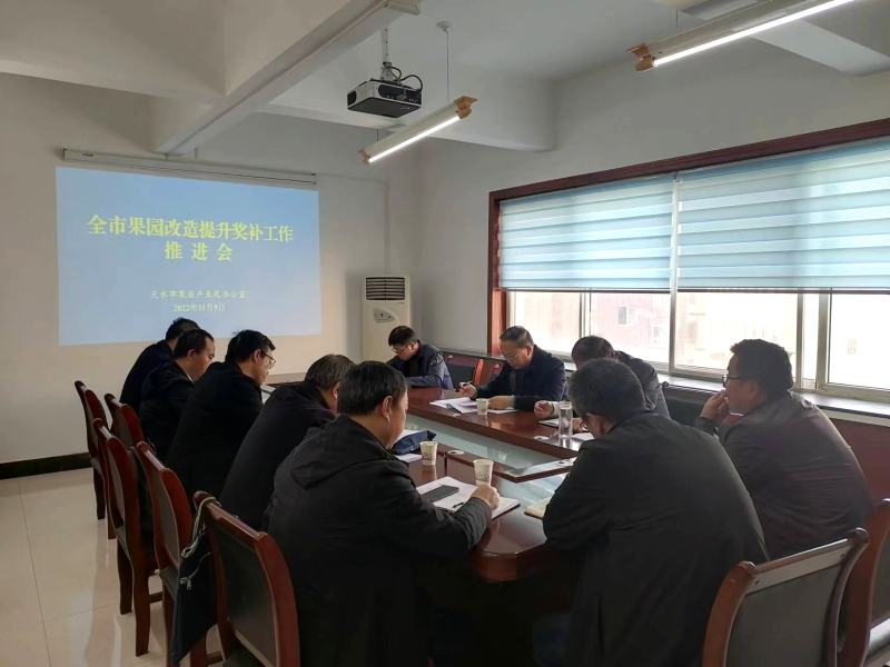 2022年11月9日,市农业农村局组织各级果业部门主要负责人和市内相关果树专家、技术骨干召开了全市果园改造提升奖补工作推进会。会议上宣读了市委办、市政府办印发的《天水市果园改造提升奖补方案(试行)》和由市委、市政府分管领导致各县区党委、政府主要领导的关于做好果园改造提升工作的一封亲笔信。针对果园改造提升奖补方案工作的内容、细节和要点在会议上进行了详细解释,听取了各县(区)果园改造提升奖补工作进展情况汇报,讨论分析了工作中存在的困难和问题,对全市果园改造提升奖补工作进行了安排部署。