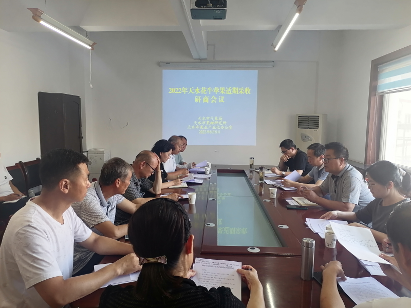 花牛苹果即将成熟上市,8月5日,市农业农村局组织市气象局、市果树所、市果业办、县区果业中心相关技术人员,知名果树专家呼丽萍教授以及花牛苹果种植合作社代表20多人,召开了2022年天水市花牛苹果适期采收研商会议。