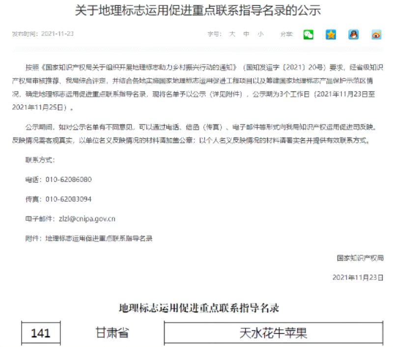 11月23日,在国家知识产权局公示的地理标志运用促进重点联系指导名录中,天水花牛苹果名列其中,这也是甘肃省上榜的5个特色农产品品牌中唯一的苹果品牌。