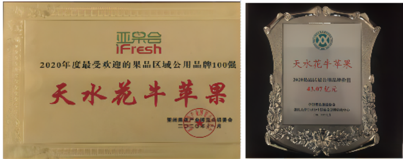 天水苹果种植始于1925年,历史悠久。自从1965年大面积种植以来,目前全市种植面积82.3万亩、结果面积73万亩、产量143万吨。天水独特的地域和气候资源优势,生产的“花牛”苹果色泽艳丽、果型高桩、五棱突出、肉质细嫩、香甜适口、品质上乘,先后荣获农业部优质农产品奖、全国名特优林业博览会金奖、中华名果、中国国际林业产业博览会金奖、中国国际农产品交易会金奖等众多殊荣;2016年“花牛苹果”商标被国家工商总局认定为中国驰名商标,2018年被国家知识产权局认定为地理标志证明商标。2020年品牌评估价值达43.04亿元,位列全国果品品牌价值榜高价值区域公用品牌前15强,并入选“甘味”农产品品牌。多年来,花牛苹果畅销全国40多个大中城市和俄罗斯、泰国、越南等东南亚、中亚、西亚20多个国家和地区。