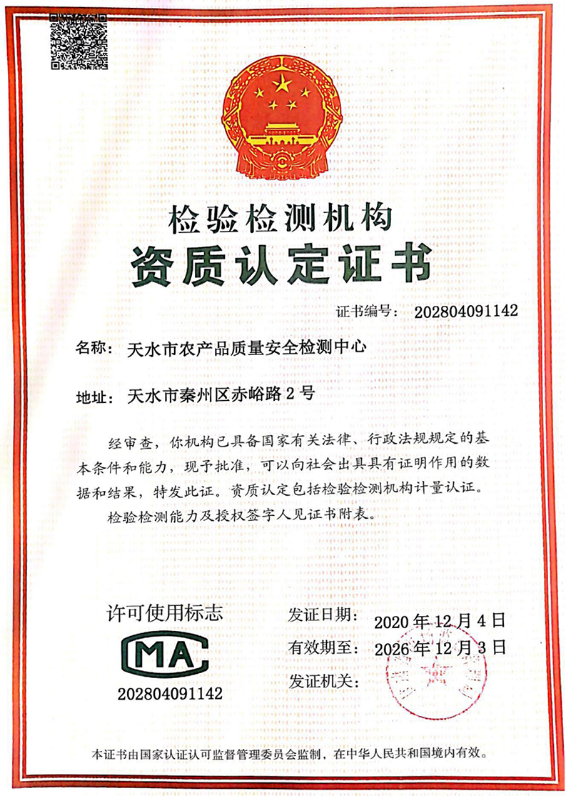 2020年12月底,天水市农产品质量安全检测中心获得了由甘肃省市场监督管理局颁发的检验检测机构资质认定证书(CMA证书),这标志着我市农产品质量安全检测技术迈上了一个新台阶。