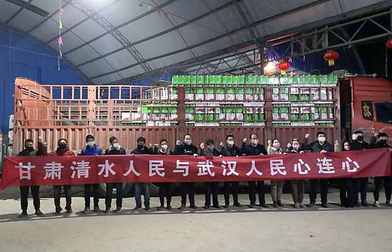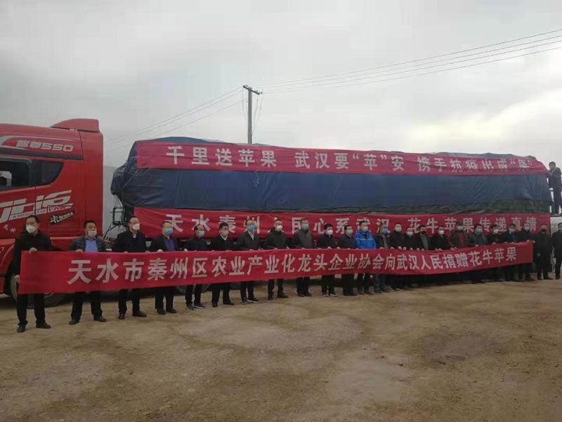 2月12日上午,在天水市农业高新园区和秦州区,分别举行爱心捐赠发车,甘肃洁通农业科技有限公司将捐赠的花牛苹果20吨、花卉1万盆发往武汉市硚口区宗关街社区卫生服务中心,秦州区农业产业化龙头企业协会协24家企业捐赠的28吨花牛苹果紧急发往武汉。到目前,我市秦州区、麦积区、秦安县、清水县31家果品省市级龙头企业和农业专业合作社,向武汉等地抗疫一线的慈善公益组织和医疗机构,共捐赠苹果(包括核桃)约118吨、花卉1万盆。