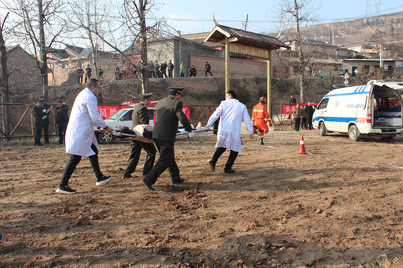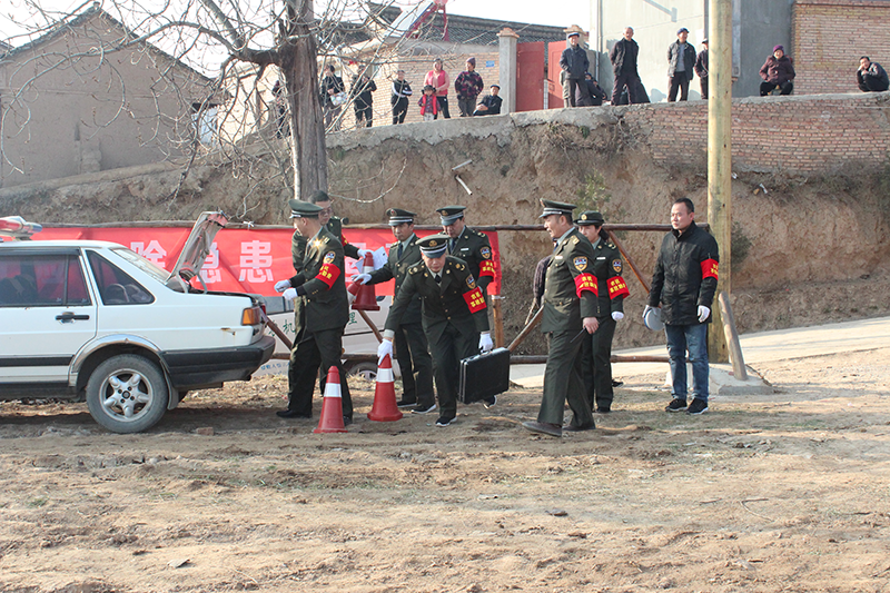 演练模拟了步沟村村民李某在使用微耕机旋耕整地作业时,因旋耕刀具碰在地里的石头上,致使微耕机侧翻,刀具飞起扎入机手腿部,造成人员受伤的农机事故应急处置过程。整个演练分事故发生、报案求救、抢救伤者、现场勘验、点评总结等环节。