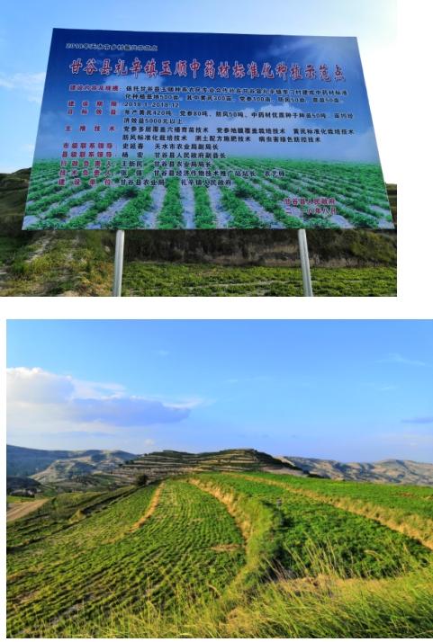 4. 甘谷县礼辛镇中药材标准化种植示范点:该示范点位于甘谷县礼辛镇,平均海拔1750米,年降水量450mm,具有种植中药材得天独厚的自然条件。示范点依托玉顺种养农民专业合作社以土地流转的形式进行建设,计划投资200万元,建成中药材标准化种植基地500亩,其中黄芪300亩,党参100亩,防风50亩,育苗50亩。截至目前,已完成投资200万元,占计划投资的100%,建成中药材标准化种植基地550亩,其中,黄芪种植300亩,党参种植100亩,防风50亩,中药材育苗100亩;推广中药材栽培技术、育苗技术和防风、柴胡地膜覆盖栽培技术,引进党参、黄芪新品种3个;中药材成熟收获后,预计年产黄芪420吨、党参80吨、防风50吨、中药材优质种子50吨,亩均经济效益达5200元以上。目前,该示范点已培训农民200人,发放中药材标准化种植技术培训资料200余份,吸收建档立卡贫困户25户107人,并优先解决贫困户到合作社务工,同时为贫困户提供技术指导和种子种苗,示范点的建设,辐射带动周边贫困户种植中药材达300多亩,有效提高了周边农户的经济收入。