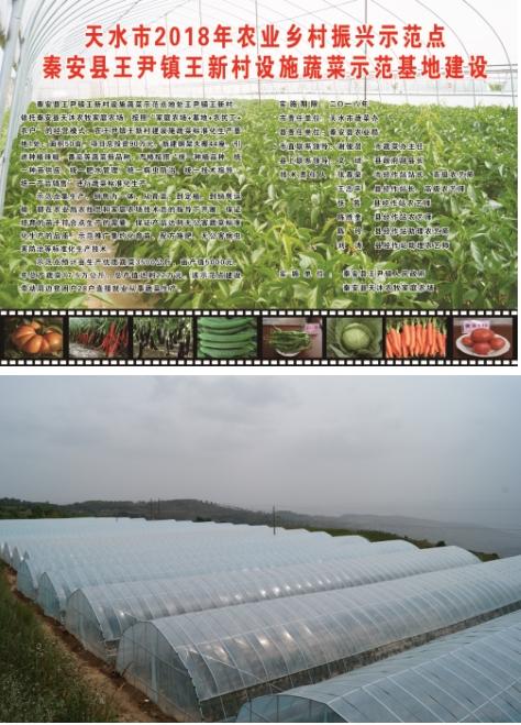 8. 秦安县设施蔬菜标准化生产示范点:该示范点位于秦安县王尹镇王新村,海拔高度1500-1730m,年均气温10℃,年平均降水量550㎜左右,无霜期170多天,光照充足,土壤肥沃,有机质含量较高,适宜蔬菜的生长发育,特别适合反季节蔬菜的生产。示范点依托秦安县天沐农牧家庭农场,按照“家庭农场+基地+农民工+农户”的经营模式,严格按照“六统一”标准进行蔬菜标准化生产。在王尹镇王新村建设施蔬菜标准化生产基地1处,面积50亩,项目总投资90万元,新建钢架大棚44座。引进种植番茄、航椒5号以及七寸红等蔬菜新品种,良种率达到100%。示范点主要生产设施辣椒20棚、设施番茄10棚、设施黄瓜5棚、设施绿叶蔬菜6棚、其它设施蔬菜3棚。露地主要生产辣椒6亩、西瓜5亩、洋芋10亩、甘蓝胡萝卜等蔬菜10多亩。示范点预计亩生产优质蔬菜3500公斤,亩产值5000元,年总产蔬菜17.5万公斤,总产值达到22万元。该示范点建设带动周边贫困户28户直接就业从事蔬菜生产。