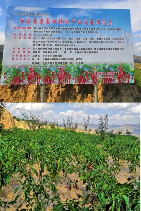 6. 甘谷县康家滩辣椒产业发展示范点:该示范点位于甘谷县新兴镇康家滩村,海拔1530米,土层深厚、光热资源丰富,年降水量450mm左右,耕地大部分为山地,适宜辣椒生长。示范点依托甘谷县康美辣椒有限责任公司承建,该公司主要进行辣椒、花椒的生产、经营、销售,拥有“甘谷辣椒”、“中国地理标志认证标志”、“大北山”、“北山红”等品牌。截至目前,该示范点已完成投资280万元,占计划投资的100%,完成线辣椒育苗250万株,移栽辣椒1020亩,建成线辣椒加工厂1处,引进线辣椒加工设备一套,建成1000平方米全钢辣椒交易市场1处。示范点主要推广“村委+公司+合作社+农户”模式,实现“三变”改革,发展订单农业,带动当地建档立卡贫困户96户380人,解决贫困人口就业35人。该示范点引进推广了航椒4号、7号及陇椒3号等新品种,建成了标准化塑料大棚6座进行线辣椒集中育苗,解决了春旱制约辣椒苗生长的瓶颈问题。同时,大力推广旱作农业技术,有效保障了春季直播的土壤墒情。今年9月份基地辣椒成熟收获后预计亩均效益达到4500元左右。