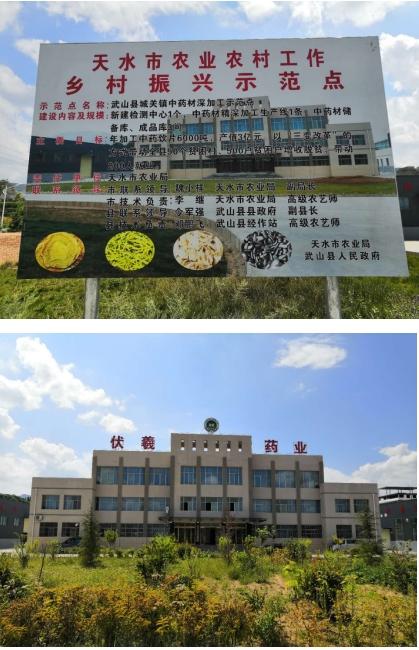 3. 武山县城关镇中药材深加工示范点:示范点位于武山城关镇工业园区,依托甘肃伏羲药业有限公司进行建设,该公司已取得《药品生产许可证》、《药品生产质量认证证书》,示范点内推行公司+基地+农户和公司+村集体+贫困户等生产经营模式,确保了公司中药材产品的数量和质量,为公司生产确保了货源,促进了生产顺利进行。示范点投资4500万元,精心组织、精细建设,建成了生产车间、前处理车间为主体的中药材精深加工生产线1条,中药材储备库、成品车间3间。购置了中药材饮片加工生产线1条,配备检测检验设备、包装设备。开展了以中药材高产栽培技术培训班12期,培训农户865人,发放技术资料1000余份。示范点预计年加工和生产中药材、中药材饮片150万公斤,年购销额6000万元,以“三变改革”的方式带动全县50个贫困村500户贫困户脱贫致富,拉动200人就近就业,种植户人均纯收入在原基础上再增加2000元,大力推动全县农业产业结构调整,有效地促进了农业增效、农民增收。