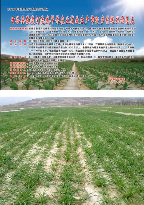 3. 甘谷县散渡河流域旱作农业高效生产示范点:该示范点涉及安远、大庄2乡镇10村,以探索抗旱增产技术为目标,以拓宽区域种植和发展农业生产为方向,按照统一品种、统一药剂拌种、统一整地播种、统一播期播量、统一机条播、统一田间管理的“六统一”要求,示范完成推广旱作农业面积1.12万亩,其中完成全膜覆土穴播小麦4800亩,全膜双垄沟播玉米6400亩。示范点完成总投资1769.6万元,投入地膜67.2吨,各种化肥488吨,投入3.5万元的优质玉米种子,累计举办技术培训班9期,受训农民2500人,发放各种宣传资料3000余份。示范推广兰天28号、天选50号、正大12等高产优质品种,开展测土配方施肥,加强病虫害综合防控,推进机械化生产,做到了良种良法配套,优良技术集成,保障了示范点的顺利建设。目前该示范点全膜覆土穴播小麦已全部收获,经市县有关专家现场测产,示范区小麦平均亩产312.97公斤,全面完成亩产280公斤的产量指标,较好的完成了年度工作任务。