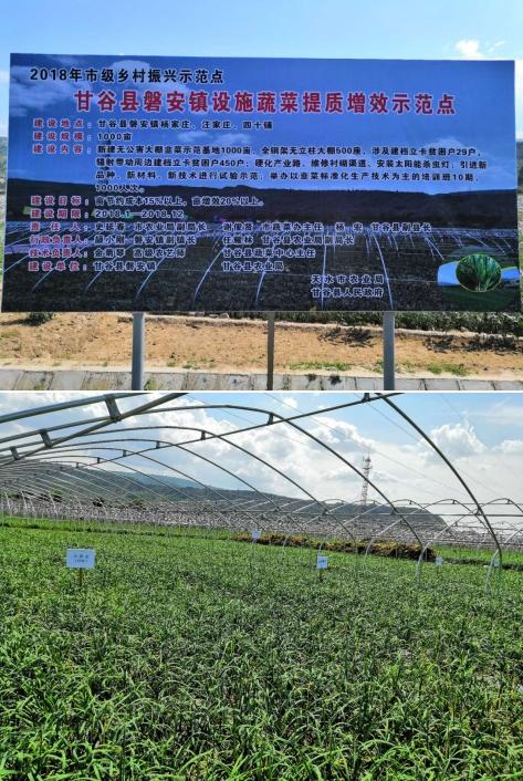 7. 甘谷县磐安镇设施蔬菜提质增效示范点:该示范点涉及磐安镇四十铺、杨家庄、汪家庄3个行政村,位于磐安镇东南片区,交通便利,大棚韭菜是该区域的主导产业。该示范点已新建成无立柱钢架大棚250亩500座,涉及建档立卡贫困户29户,辐射带动周边建档立卡贫困户450户,提高了农业生产的科技含量,培育了当地富民产业;硬化产业路900.3米,共3601.2米2,衬砌渠道1600米,安装太阳能杀虫灯20盏;引进胜利雪韭等优良品种4个,并进行品种对比试验,引进苏云金杆菌、阿维菌素、1.1%苦参碱等无公害农药,进行试验示范,筛选出对韭菜安全无毒的生物农药防治韭蛆;推广了黑色地膜移栽、有色棚膜、粘虫色板、生物农药、配方施肥等技术,并开展了以韭菜标准化栽培技术为主的科技培训班10期,累计培训人数1000人次,提高大棚韭菜的标准化栽培技术。示范点的建设使得当地基础设施显著提高,提高了韭菜标准化生产水平,对加快全县蔬菜产业发展、增加农民收入起到了积极的促进作用。