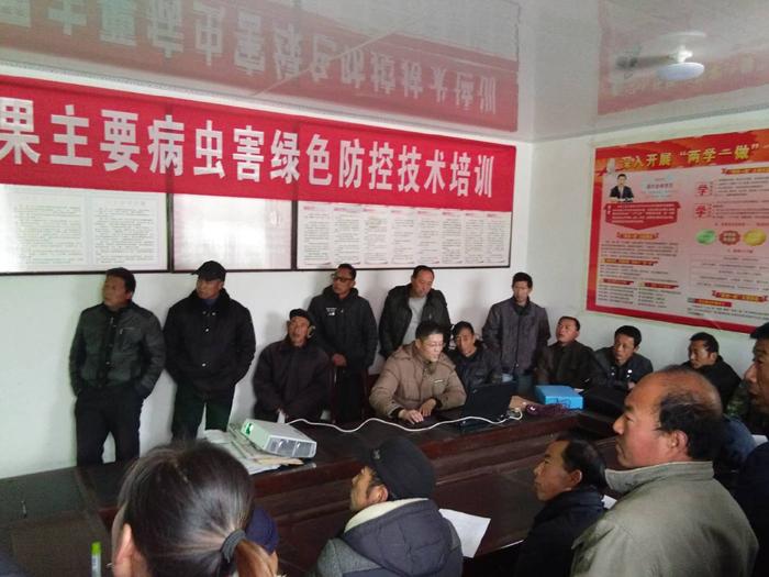 同时现场指导3户果农进行了冬季清园及果树涂白操作。免费发放了《苹果园病虫害周年防治历》、《怎样用药苹果才没有黑红点》、《果树涂白剂的作用及配方》等科普资料300余份,价值2360元阿维菌素、丙环唑、辛菌胺醋酸盐、涂白剂等农药12箱(桶)150公斤,2018年科普挂历80本。此次培训受到了广大果农的热烈欢迎,现场气氛活跃、互动频繁,起到了推广技术、服务群众的目的。