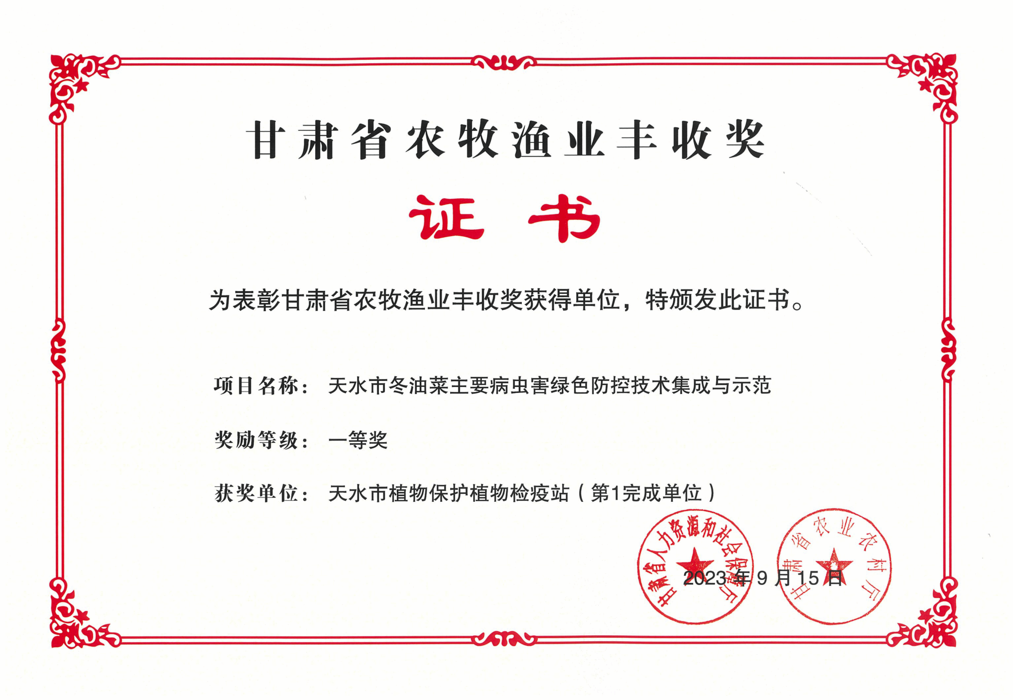 近日,由省人力资源和社会保障厅、省农业农村厅联合表彰的2019—2022年度甘肃省农牧渔业丰收奖获奖成果公布,我市9个项目35个单位136名个人受到表彰。其中“天水市冬油菜主要病虫害绿色防控技术集成与示范”项目荣获一等奖,“山旱地冷凉蔬菜高效栽培模式集成技术研究与示范推广”等3个项目荣获二等奖,“小杂粮新品种引进试验示范”等5个项目荣获三等奖。