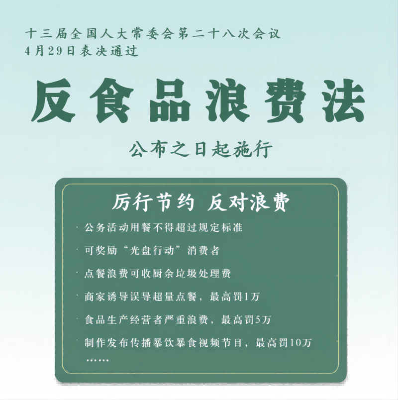2021年4月29日第十三全国人民代表大会常务委员会第二十八次会议通过《中华人民共和国反食品浪费法》。全国各地积极开展各类主题宣传实践活动,大力营造爱粮节粮的浓厚氛围,切实推动节粮减损 ,让健康消费成为社会新风尚。