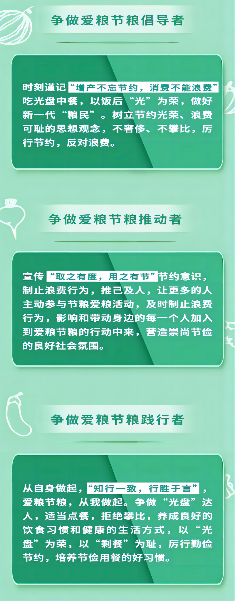 节约粮食是一种美德,是一种素质,更是一种责任。爱粮节粮需要每一个人的参与,值此全国粮食安全周之际,倡导大家: