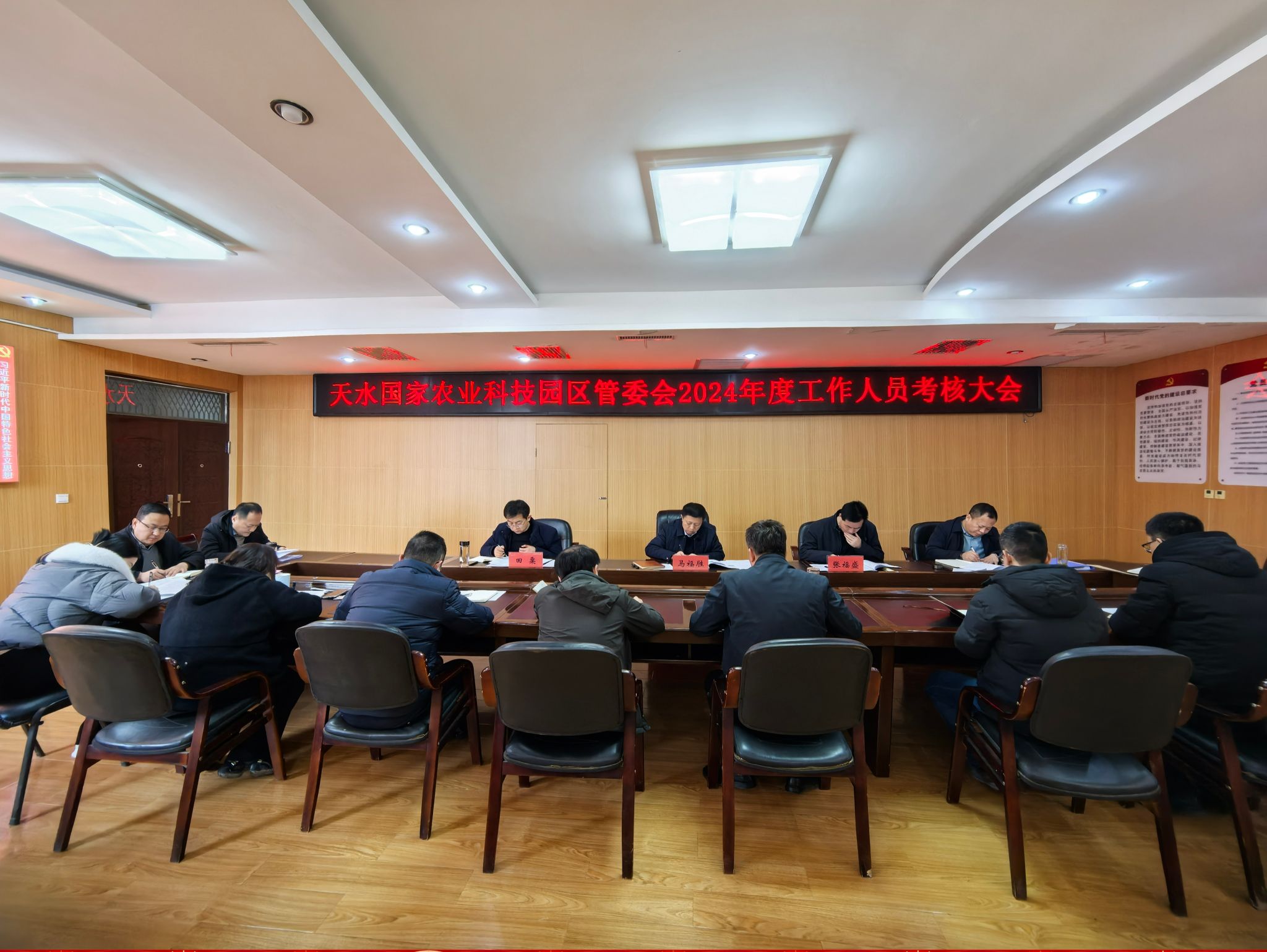 近日,天水国家农业科技园区召开2024年干部职工考核大会,全面总结2024年度工作,查找问题和短板,谋划部署2025年工作重点任务。园区管委会主要负责同志主持会议,机关全体干部职工参加会议。