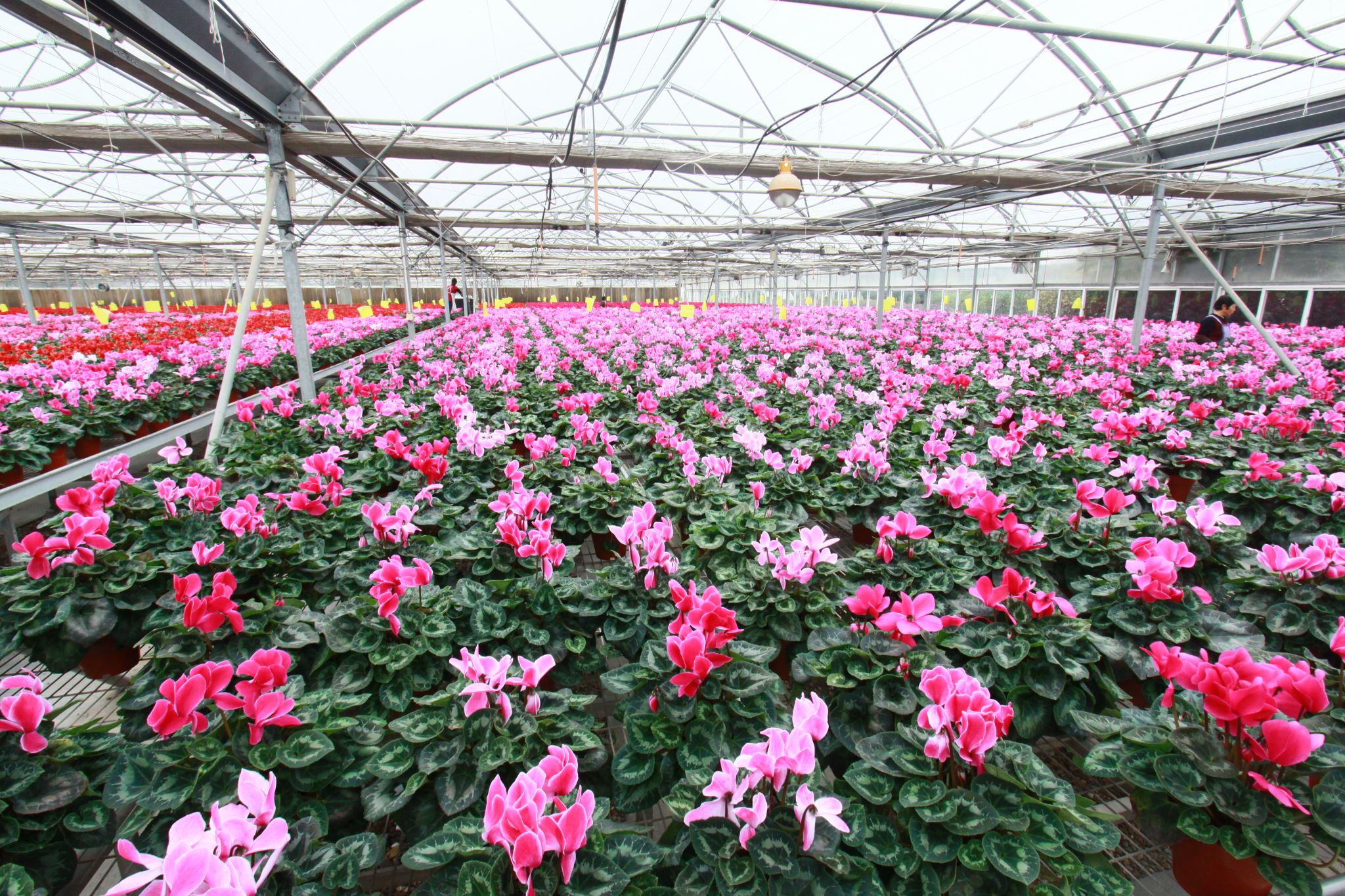 入秋后,天水国家农业科技园区花卉种植大棚内,各色仙客来竞相绽放,宛如一片绚烂的花海,吸引了众多客商前来考察采购,订单量较去年同期增长20%以上。目前,园区内仙客来主要热销品种达12个,依托现代化智能温室、自动苗床、保温覆盖、喷滴灌及水肥一体化等先进设施,实现了对温度、湿度、光照等环境因子的精准调控。科学的生产管理与精细化养护,使得仙客来平均花期延长至5个月以上,优质商品花率达到95%,深受市场青睐。