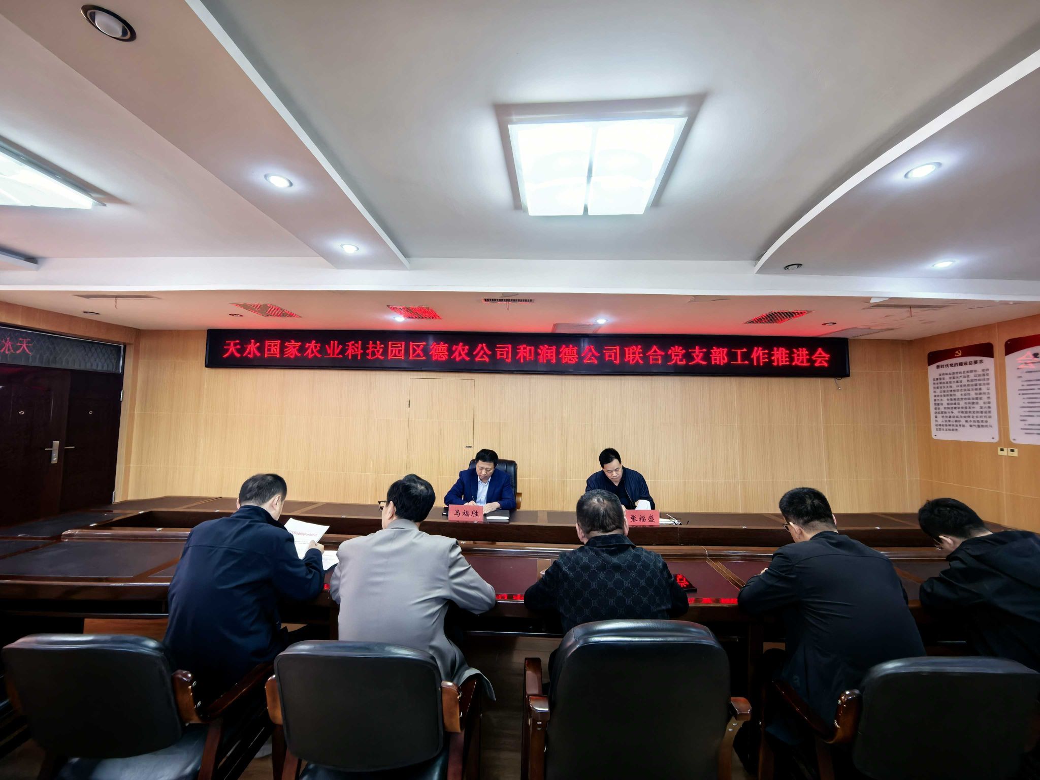2025年10月10日,天水国家农业科技园区党工委主持召开德农公司与润德公司联合党支部工作推进会。会议由党工委书记、管委会主任马福胜主持,党工委副书记、党支部党建指导员、新任党支部书记及相关企业负责人参加会议。