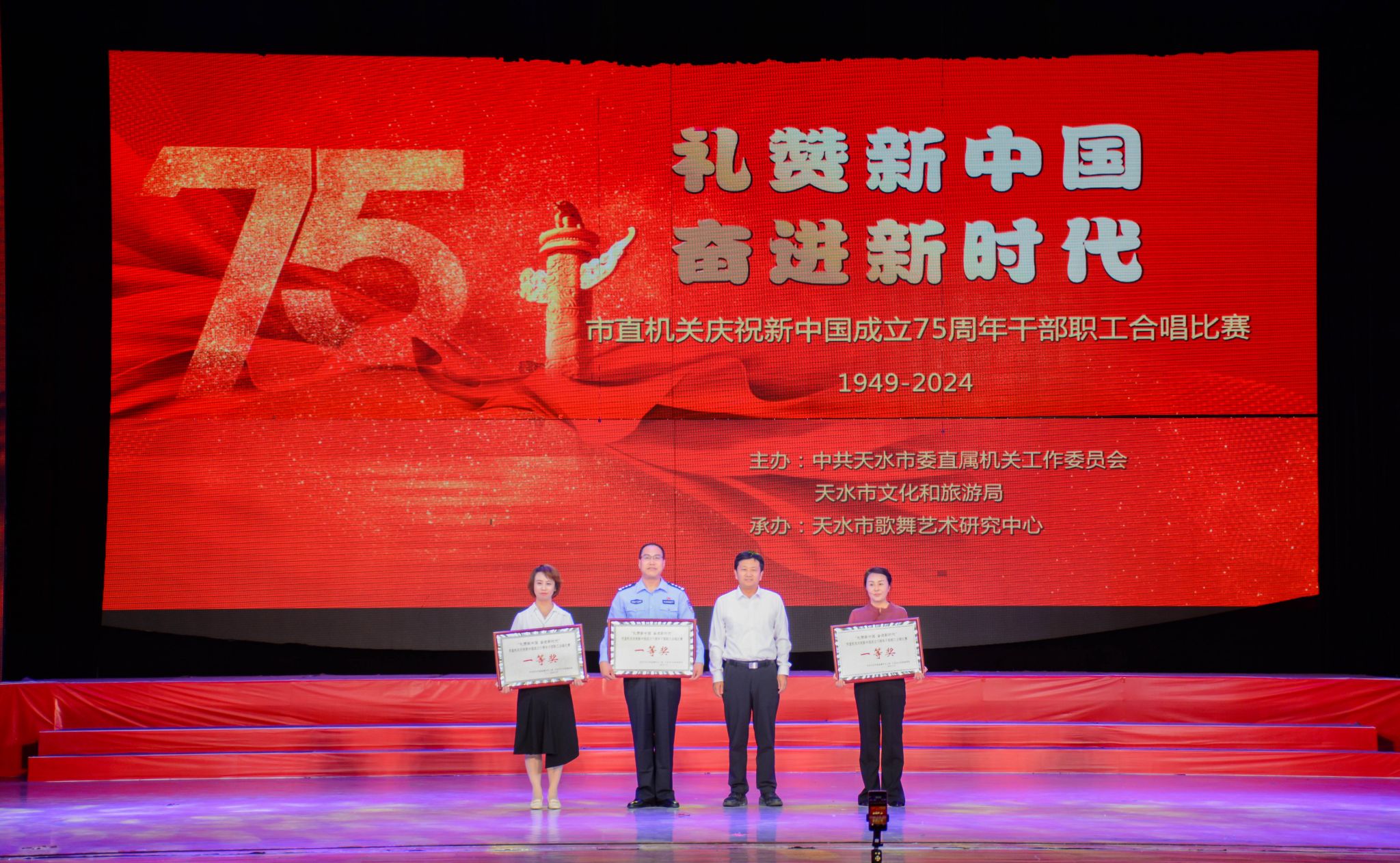 9月24日,由中共天水市委直属机关工委、天水市文化和旅游局联合主办,天水市歌舞艺术研究中心承办的“礼赞新中国 奋进新时代”市直机关庆祝新中国成立75周年干部职工合唱比赛在秦州大剧院精彩上演。来自市直及驻市部省属机关事业单位的23支代表队1400多名党员齐聚一堂,放声歌唱,用歌声向伟大祖国生日献礼。天水市人社局代表队荣获合唱比赛一等奖。