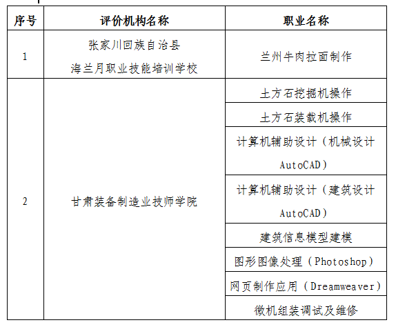 根据人社部办公厅印发《关于做好部门行业职业技能等级认定试点工作的通知》、省人社厅《关于开展社会培训评价组织征集遴选工作的通知》等文件精神,按照成熟一家、申报一家、评估一家和对社会评价组织采取动态管理的要求,为进一步做好我市职业技能等级认定工作,我局对拟申报开展职业技能等级认定和专项职业能力考核的机构进行了材料审核及实地勘验。现将拟同意备案职业(工种)公示如下: